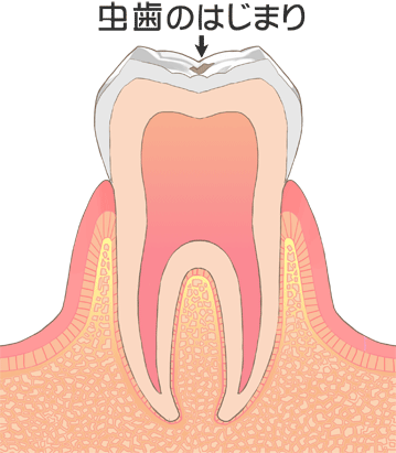 歯の表面にあるエナメル質の中にむし歯菌が進入して穴が空いた状態です。ここまで進行してしまうと、もう再石灰化はほとんど期待できません。